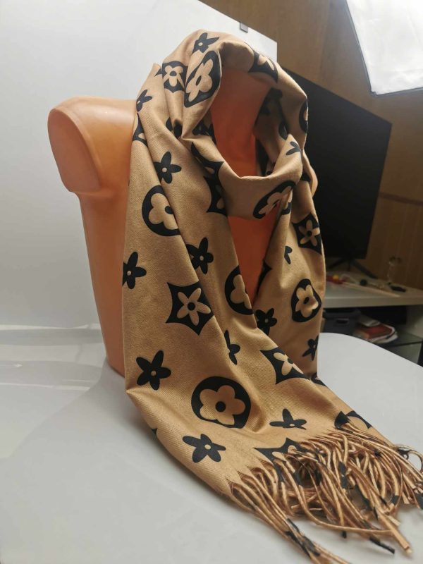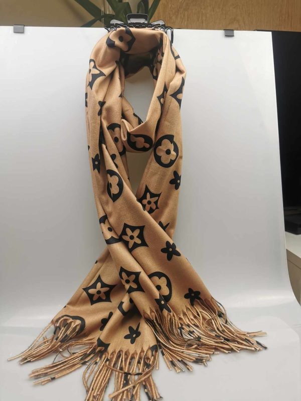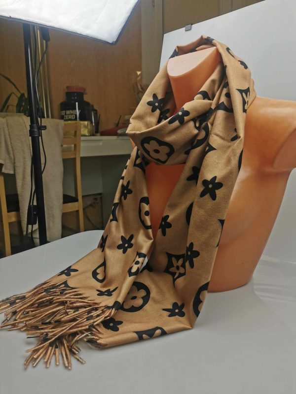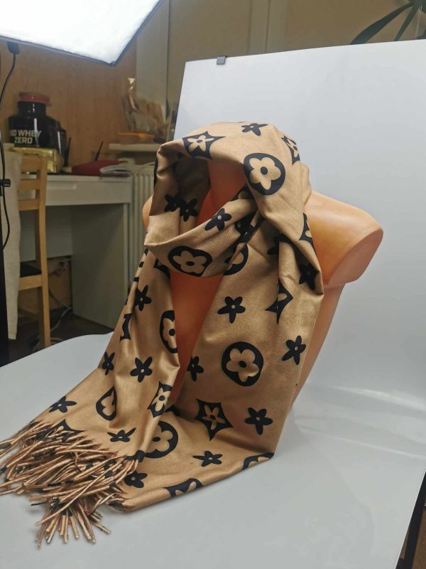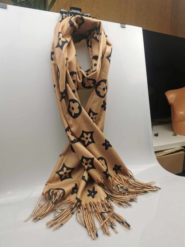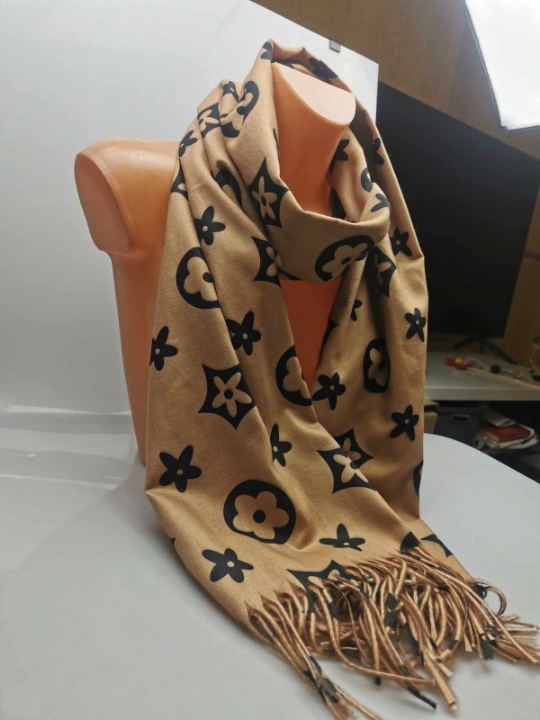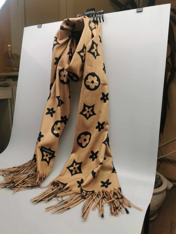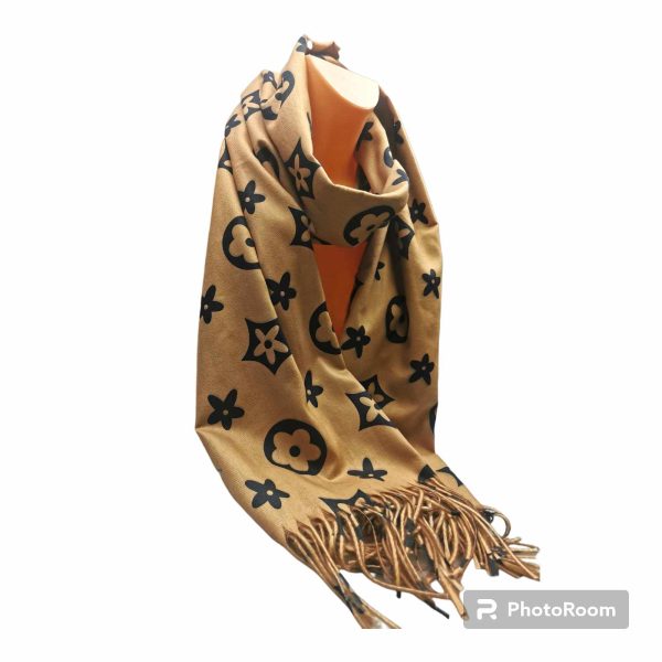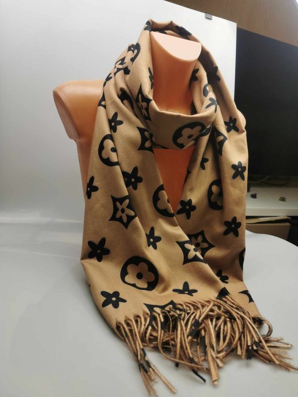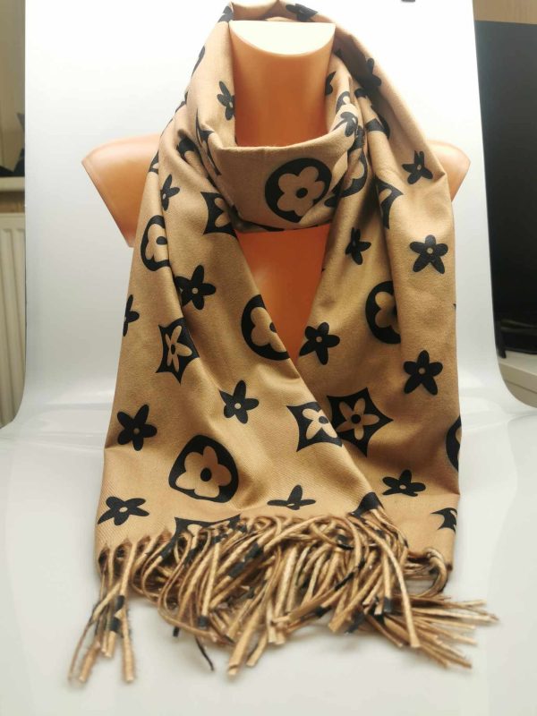 Moteriškas stilingas smėlio spalvos šalikas su vilna. Gražiai dera prie klasikinio ar kasdieninio stiliaus, išraiškingas įvaizdžio akcentas. Praktiškas vilnos ir viskozės ilgaamžis audinys labai švelnus ir jaukus dėvint, tinka rudens/žiemos sezonų metu. Šalikas papuoštas išraiškingais ornamentais ir kutais.