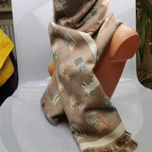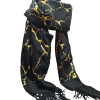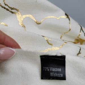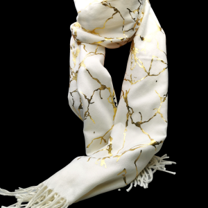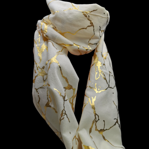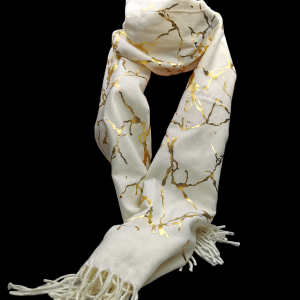 Moteriškas stilingas baltas šalikas su kutais. Medvilnės ir viskozės purus audinys labai švelnus ir jaukus dėvint, tinka rudens/pavasario sezonų metu. Šalikas papuoštas išraiškingais aukso spalvos ornamentais, dera prie kasdieninio stiliaus, norint ryškesnio akcento.
