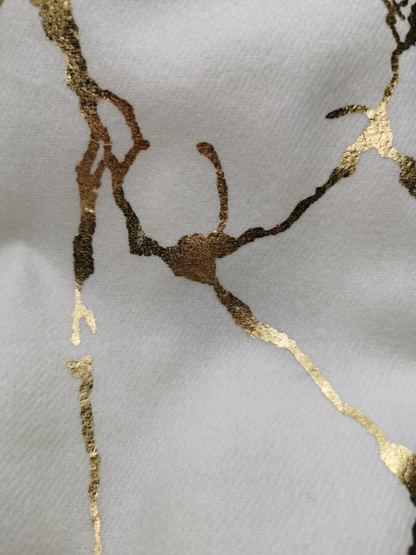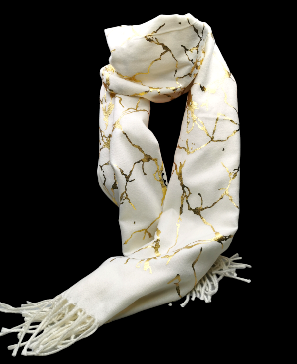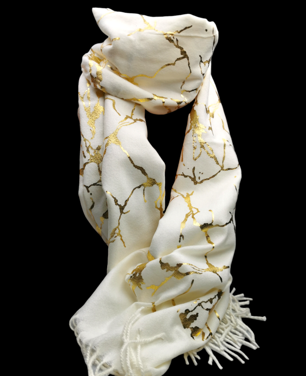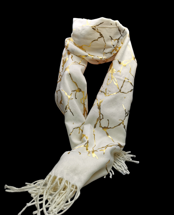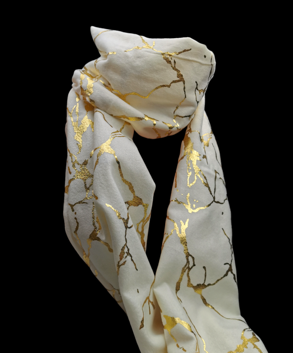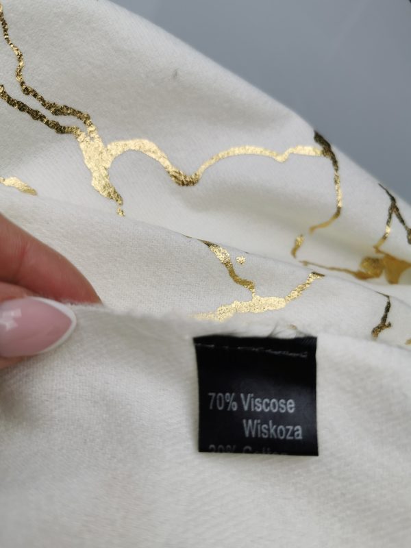 Moteriškas stilingas baltas šalikas su kutais. Medvilnės ir viskozės purus audinys labai švelnus ir jaukus dėvint, tinka rudens/pavasario sezonų metu. Šalikas papuoštas išraiškingais aukso spalvos ornamentais, dera prie kasdieninio stiliaus, norint ryškesnio akcento.